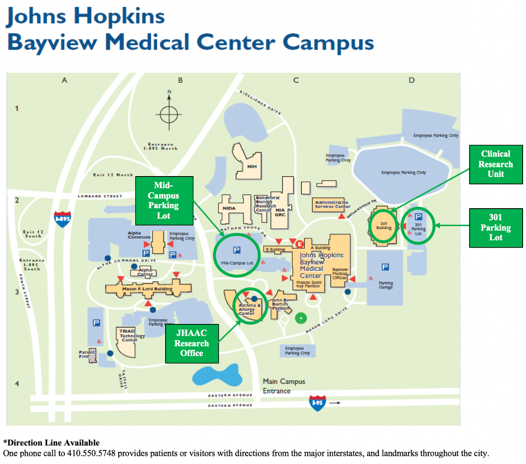 For the screening visit and DLMO overnight night, you will come to the Johns Hopkins Bayview Clinical Research Unit, as indicated on the map below.